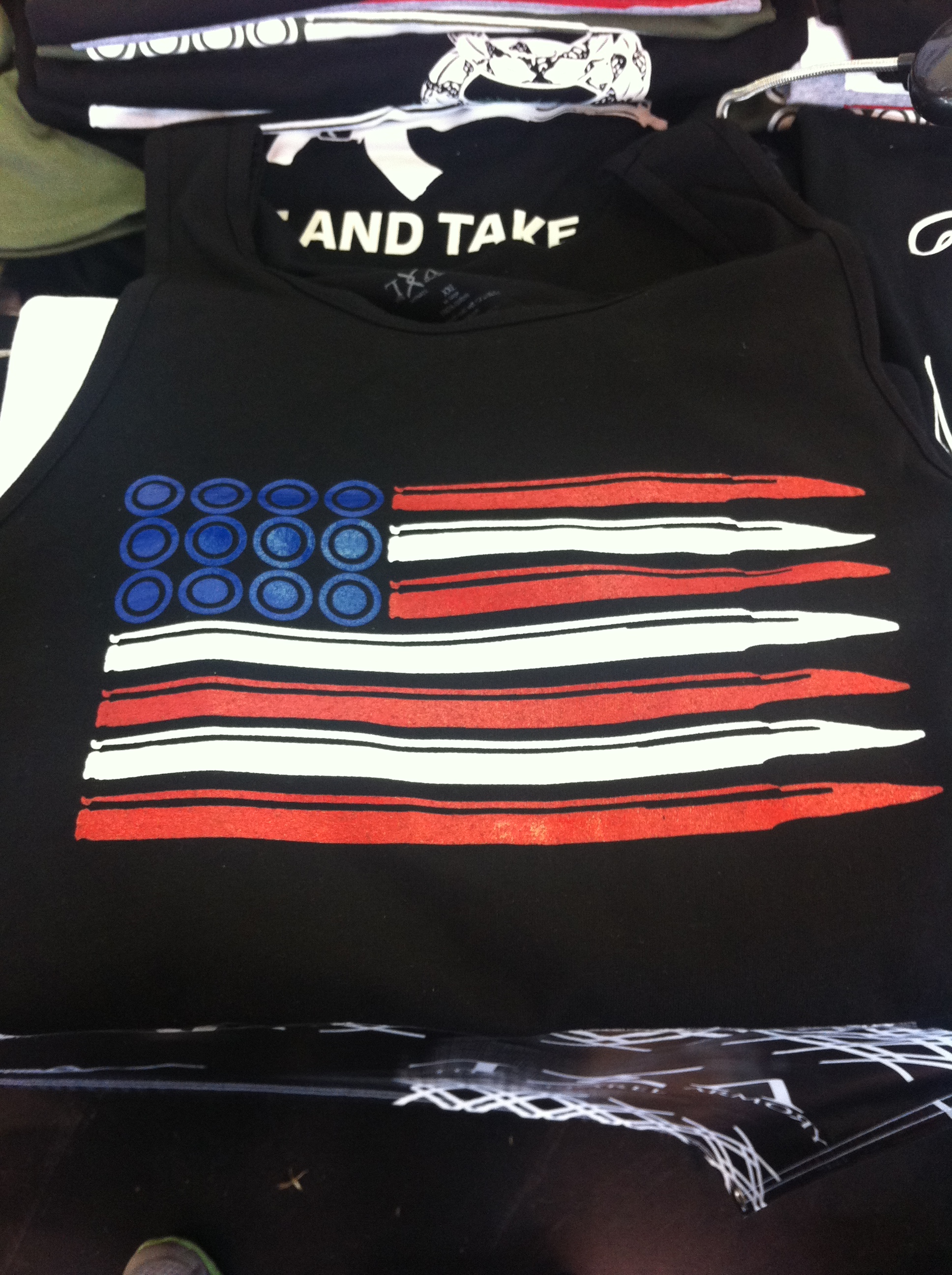 Clearly the main demographic of the attendees was white, middle-aged, over weight Republicans. I’d say that one out of three of the attendees had camouflage backpacks and a slightly creepy loner aura, plenty of Christopher Dorners or Raul Moats in the making. There were lots of T-Shirt stands selling shirts with scary and violent messages: