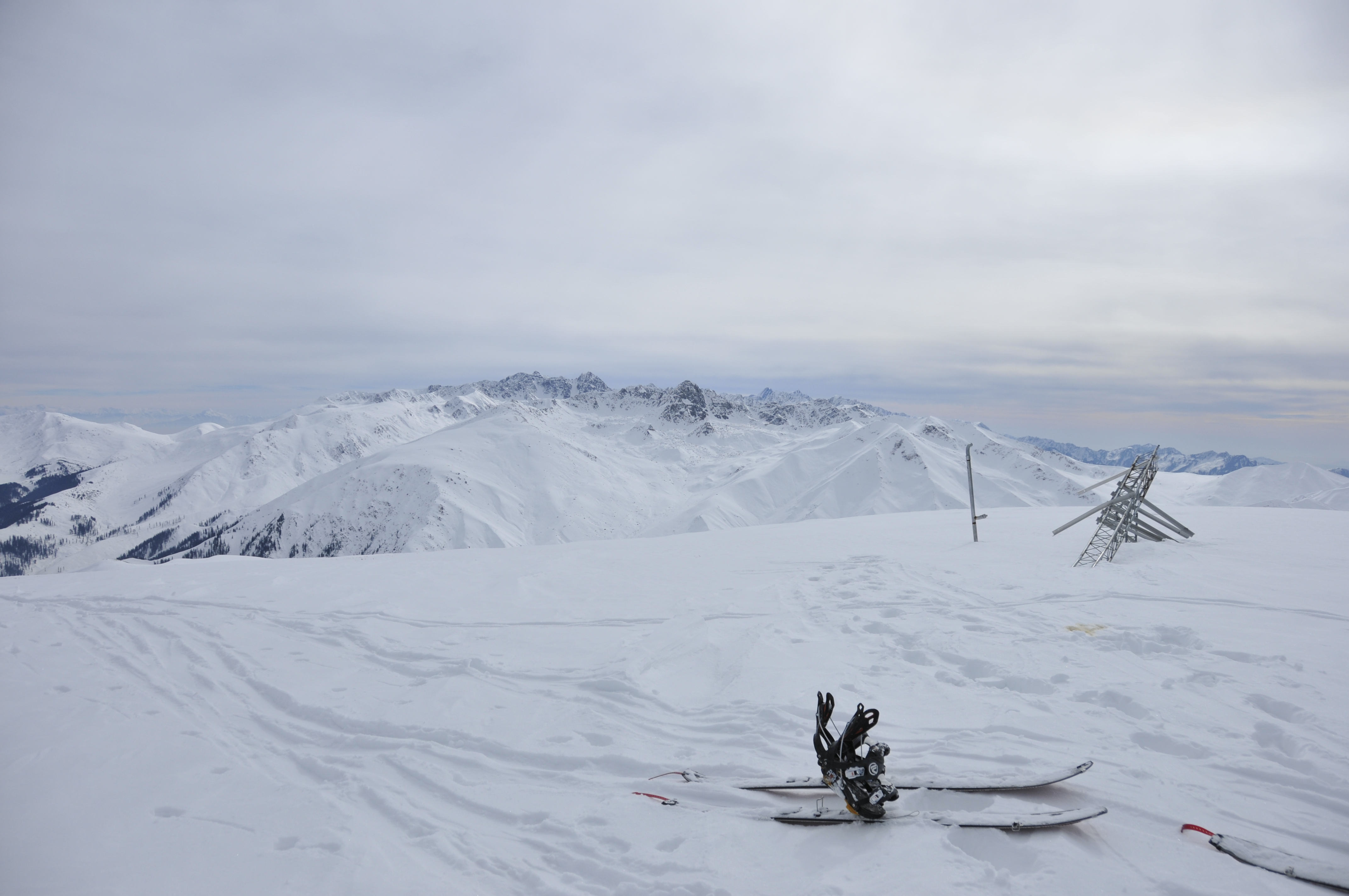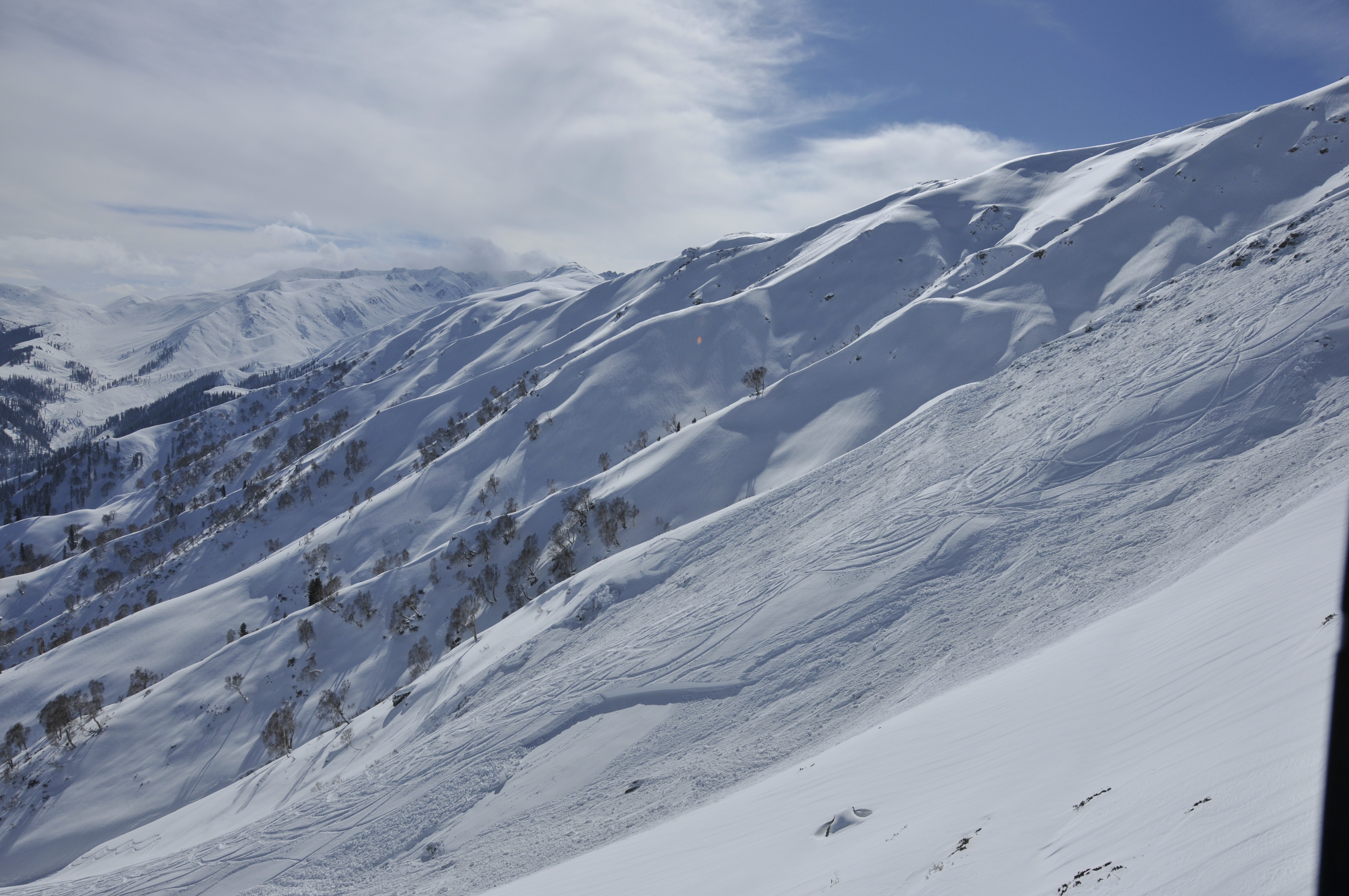 Our second day from last it was a blue sky day – and hence very high risk avalanche conditions. Every Tuesday the head of ski patrol and American transplant Colin Mitchell gives a snow report for all the powder hounds in the resort. The verdict was pretty much ‘enter at your own risk’. The weather conditions of the season all met to form a ‘perfect storm’ avalanche scenario. Preceding the storm the lack of snow formed a 4 inch hoar layer which had warmed and cooled over weeks to become very unstable. The metre of heavy fresh dumped on this would be waiting to drop with any slight pressure – or not slight if you are a group of heavy footed snowboarders – causing slab avalanches that could gather enough momentum to take out a whole valley. Bigger mountains means bigger avalanche. The fact that it was blue skies and sunny – hence heating up that meter of snow only added to the danger ingredient.