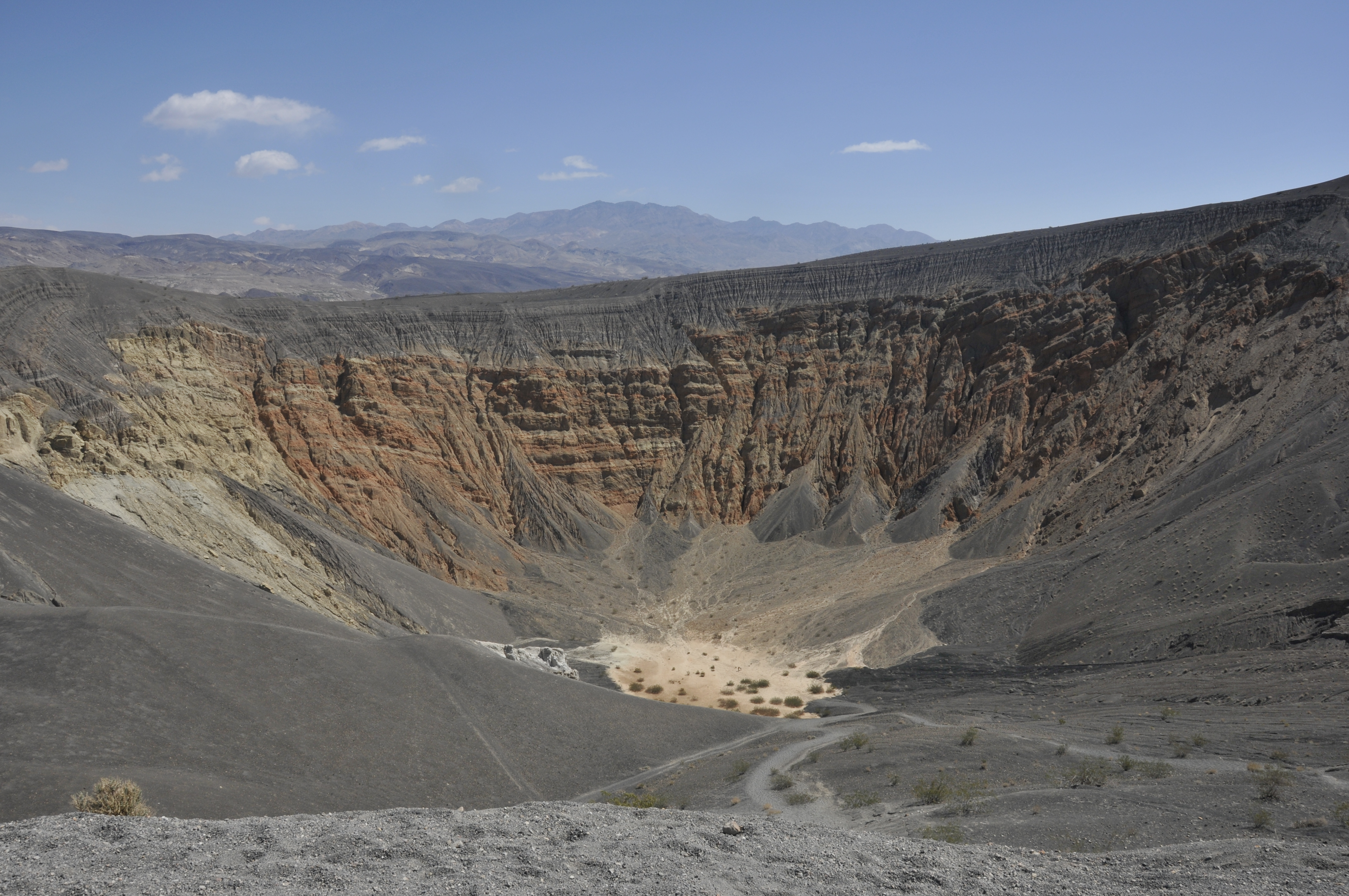 American National Parks are quite well run and Death Valley is no different in that all the major places of interest are well marked. We ticked off the main ‘must sees’ – Zabriskie Point (amazing views of the badlands, also the name of a great film by Michelangelo Antonioni), Ubehebe Crater (into which we hiked), Mesquite Flat sand dunes, Devils Golf Course, Badwater Basin (lowest point in US at 282 feet below sea level), Golden Canyon and Artists Drive. The scenery and colours of the rocks are amazing as due to volcanic activity the geology of the region has revealed many minerals, many of which have been mined over the years, including bauxite and of course gold. Artists Drive stands out for the amazing palette of pastels in the rocks – sands, amber, salmon pinks, grey blues, red and rusty reds. The views are mesmerizing and quite unlike anything I’ve seen…