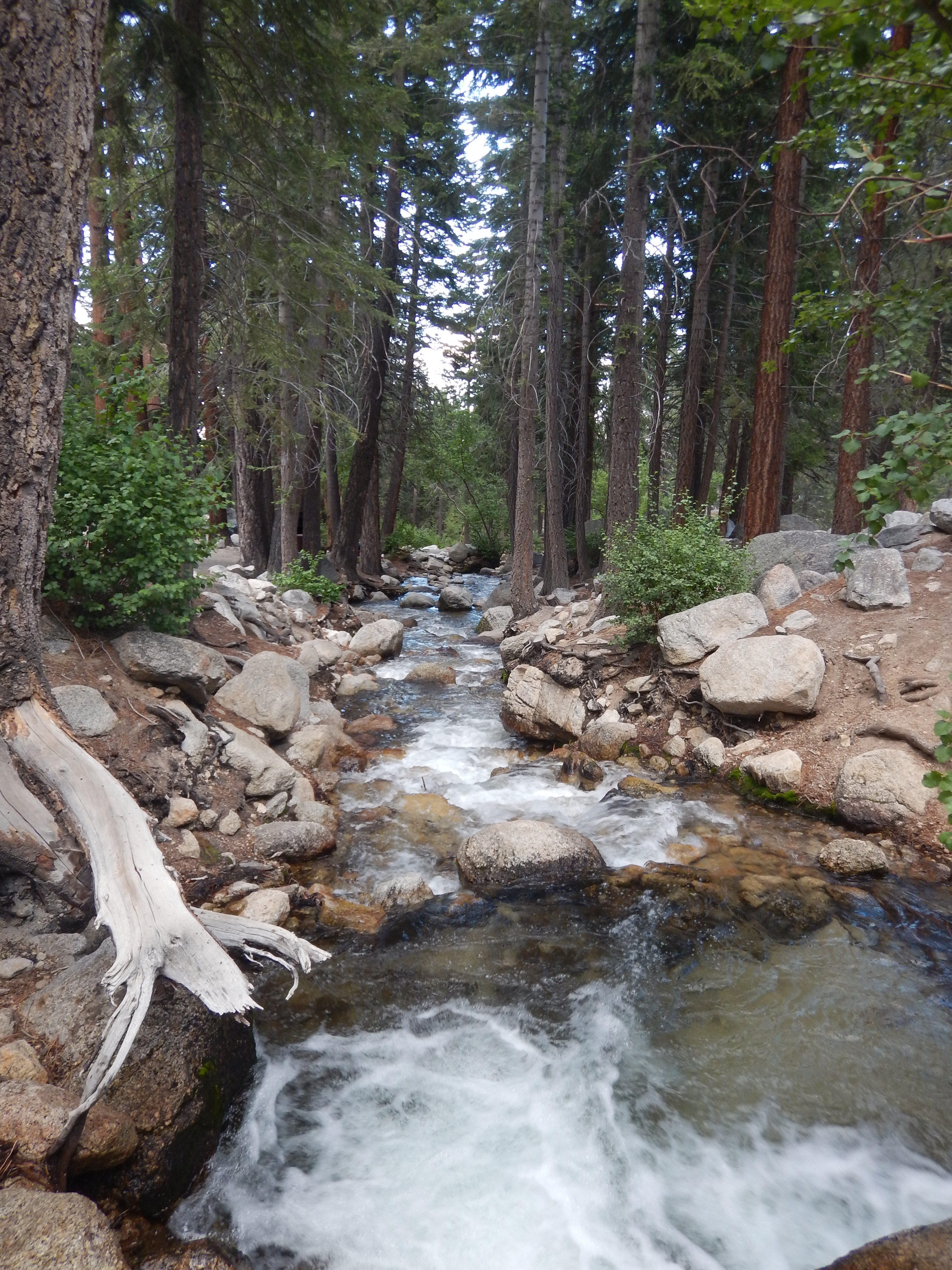 We drove futher up the valley to the campsite and I was immediately struck by the sheer, vertical granite faces either side of the valley. Looking up skywards you could see jagged peaks and needles, a more dramatic mountain scenery normally associated with the Alps. We were definitely in high mountain territory. Lower down in the high desert the temperatures has been pushing 100 so I was concerned but as we ascended they dipped to the low 80s. Our campsite was exquisite, set amongst tall sequoias with Lone Pine Creek babbling in the background, an idylic pastoral setting you wouldn’t expect being so close to the desert.