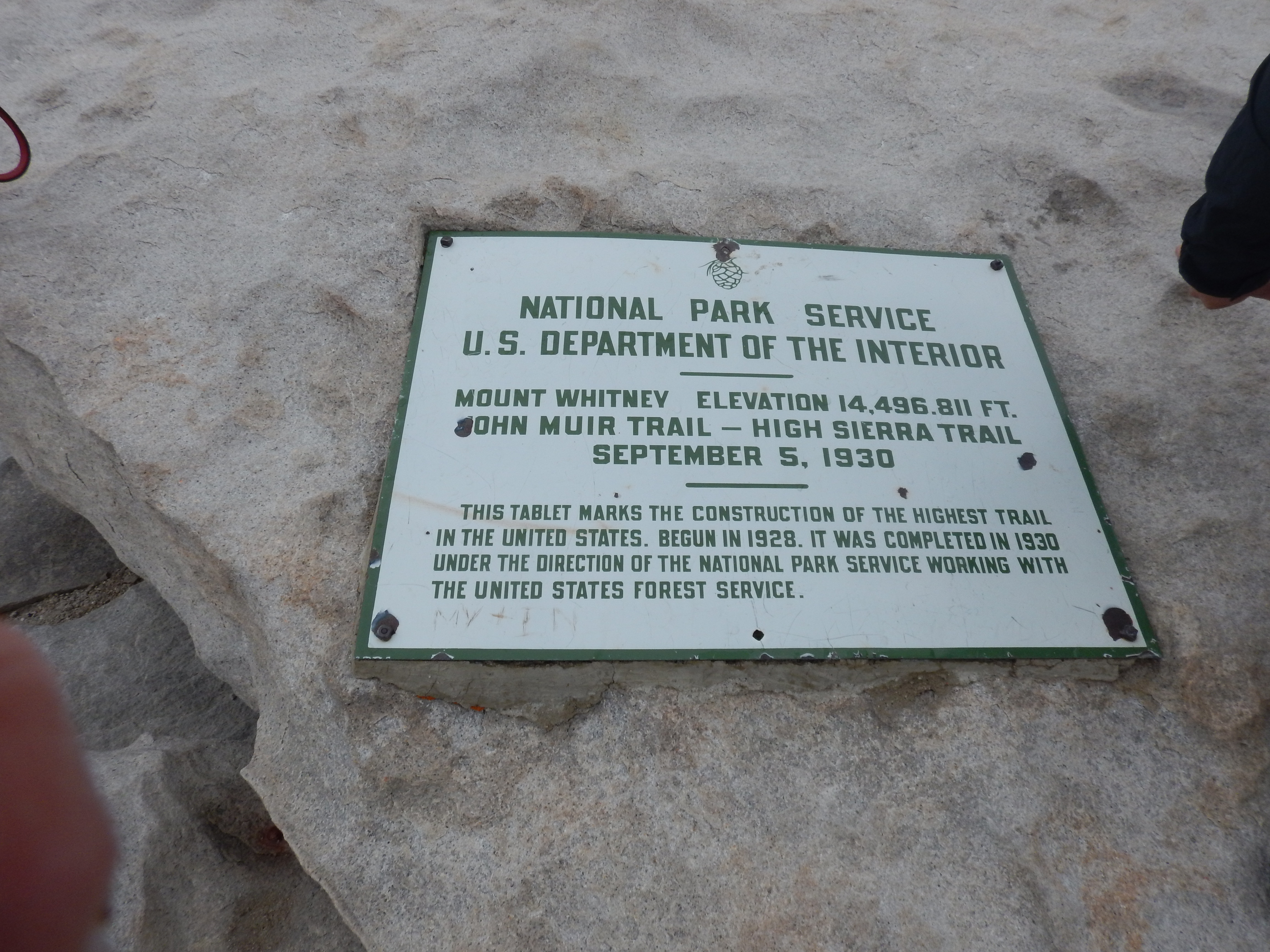 At this point it was where the trite ‘climbing mountains parallels life’ metaphors kick in. Despite the setbacks and struggles of the journey, keep the destination in mind as your goal. No pain no gain. Try and adopt a zen like meditative approach to the journey – mind over matter. Okay I hurt now but this is a passing moment. Keep going. Keep going. At 12.30 we reached the summit. I lied down on my back on a large slab of rock. I could have quite easily gone to sleep. Unfortunately clouds had come in so we couldn’t see much from the lookout. We’d did it! I treated myself to a Snickers bar (my dangled carrot motivational treat for the top) and we took our photos next to the Whitney summit sign. Then we signed the guest book in the Smithsonian hut. Then I thought to myself; ‘hang on, I’m only half way through – now I’ve got eleven more miles to go downhill whilst tired, arguably the most challenging bit. And I am totally cream crackered’.