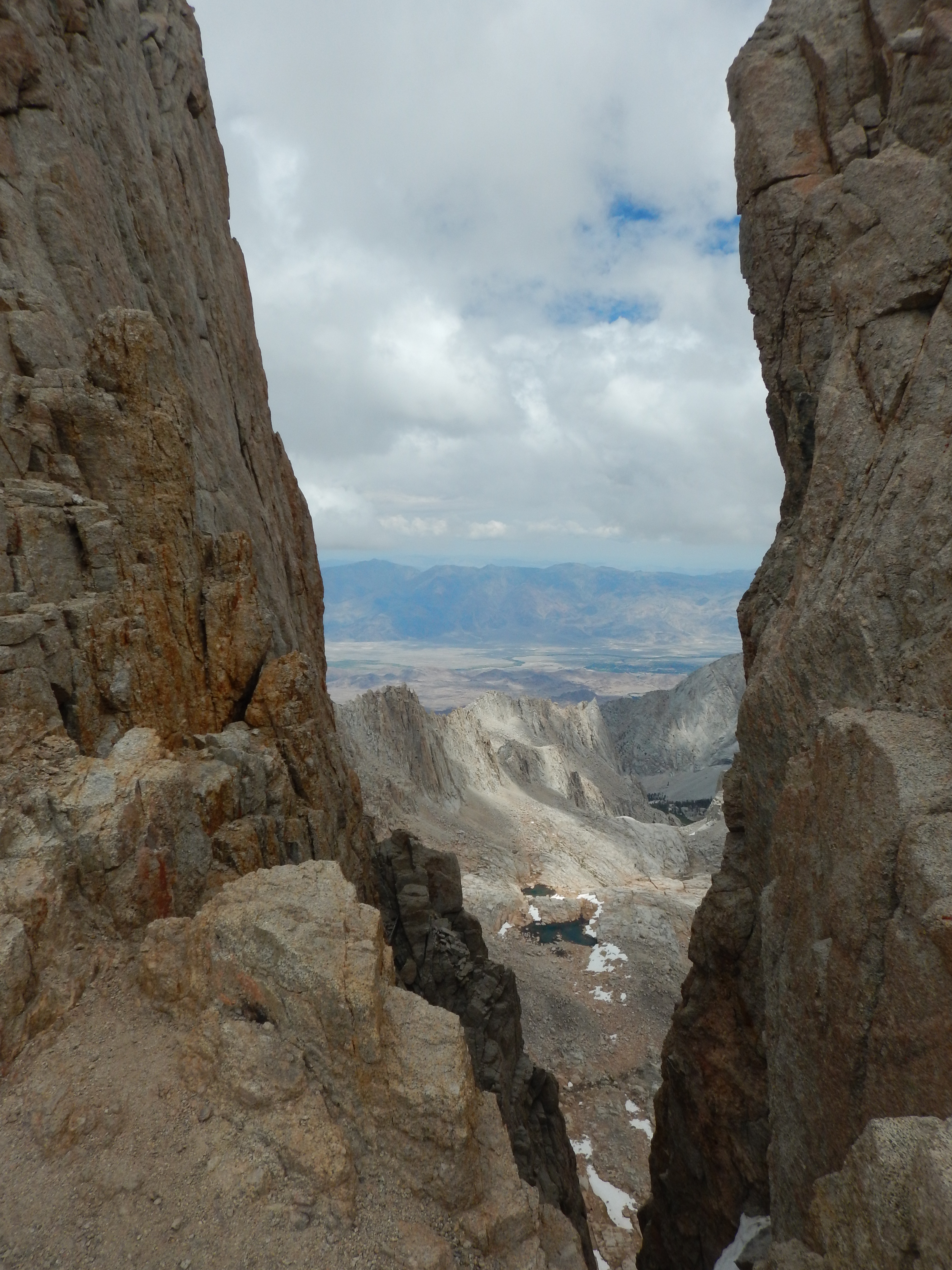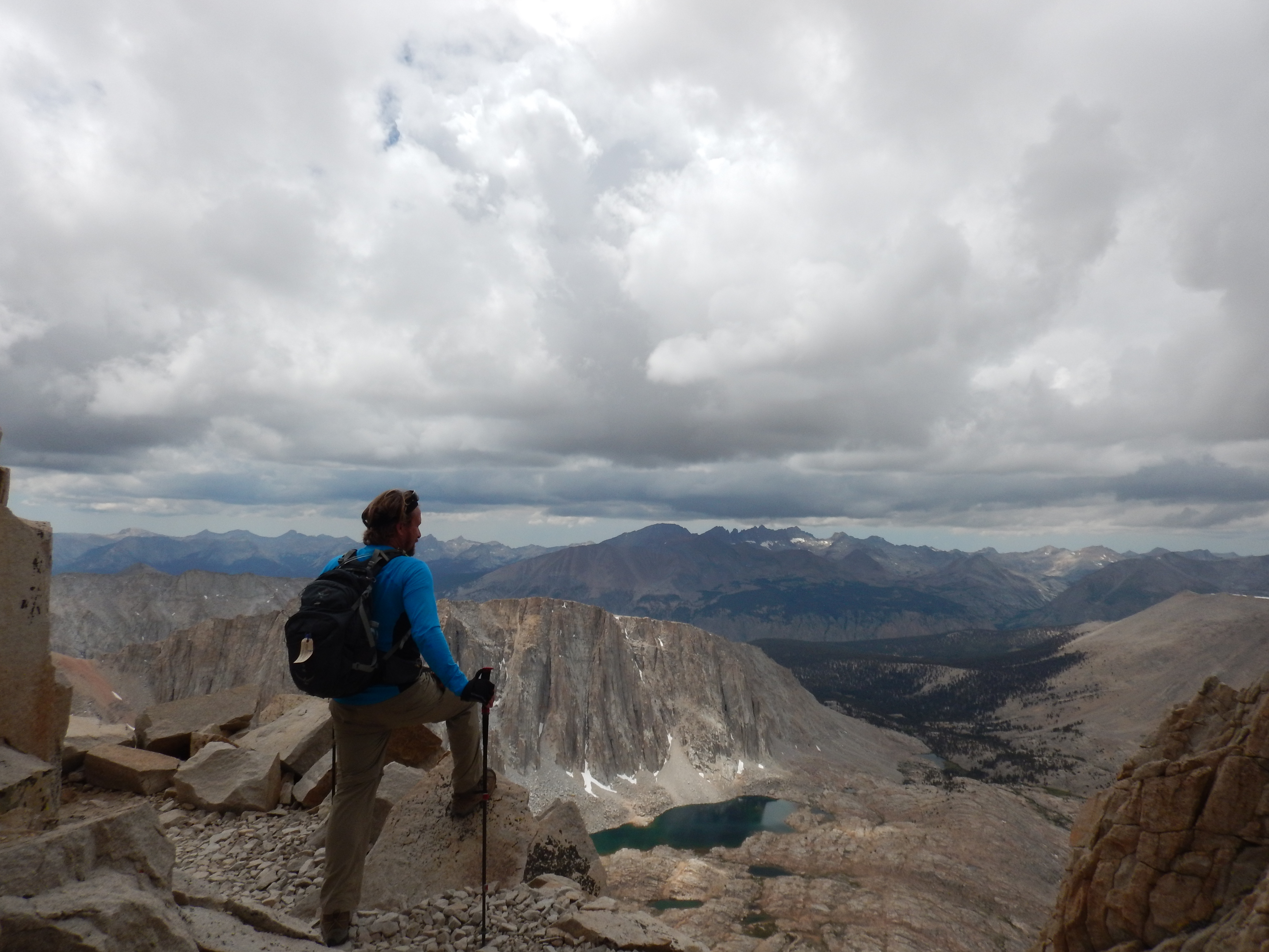 Finally we reached the top of 99 switchbacks at Trail Crest (13650) – this is where it really started to get breathtaking. From here you look outwards to Mt Hithcock (13186) with deep blue lakes in the foreground, parts of the Kings Canyon sequoia forest are visible in the high plateau valley and beyond that more wildnerness with multitple 13,000 plus peaks of the High Sierras as far as the eye can see. It was Narnia meets Lord of the Rings. An immense, vast uninhabited wilderness of sublime and spellbinding beauty. At this point we had completed 8 miles of the hike. Only three more miles to the peak. Although still 14 miles back to base camp after – if – we summit. It was a constant math equation in my head – how many miles down? How high are we? Are we there yet?