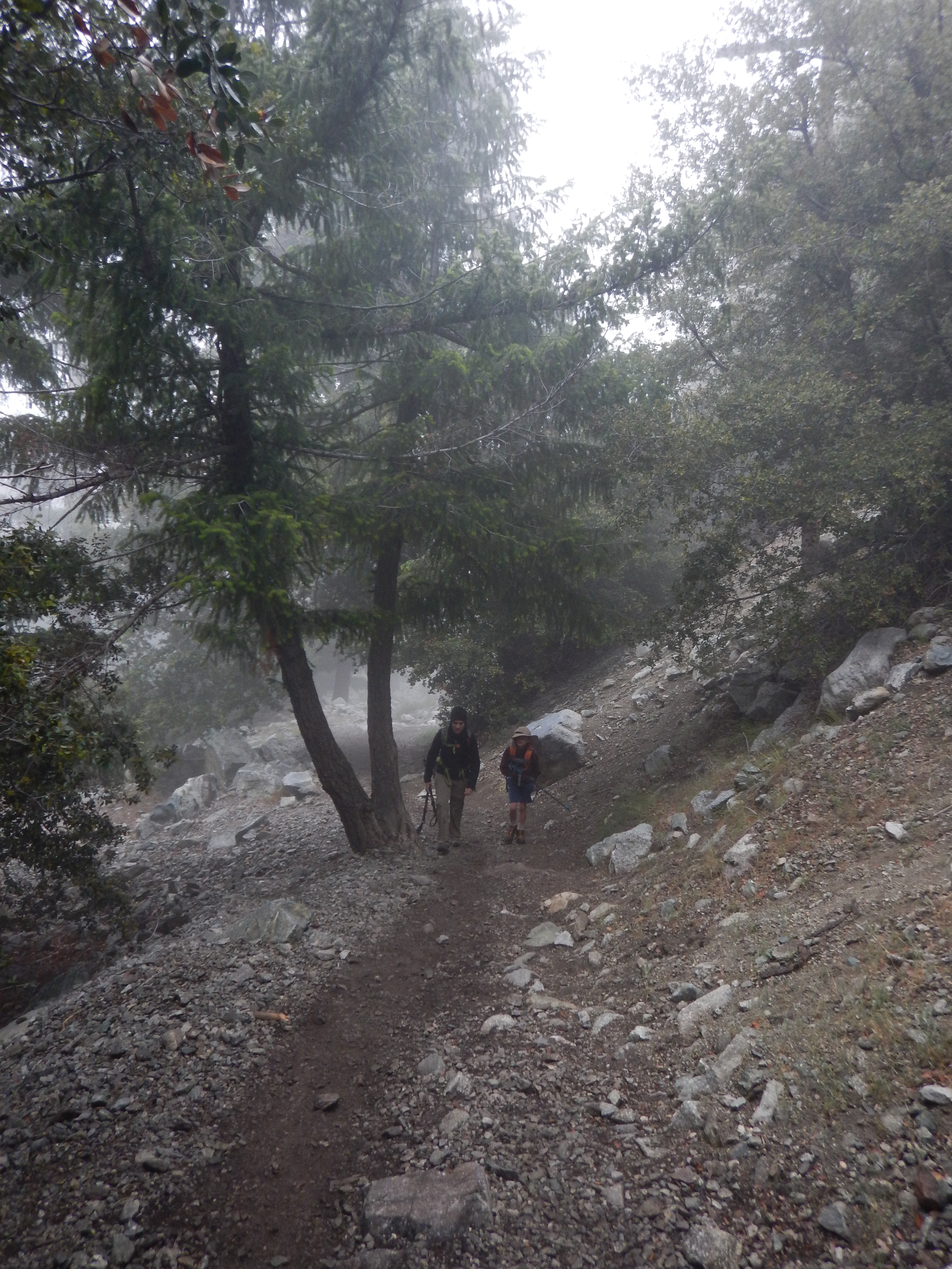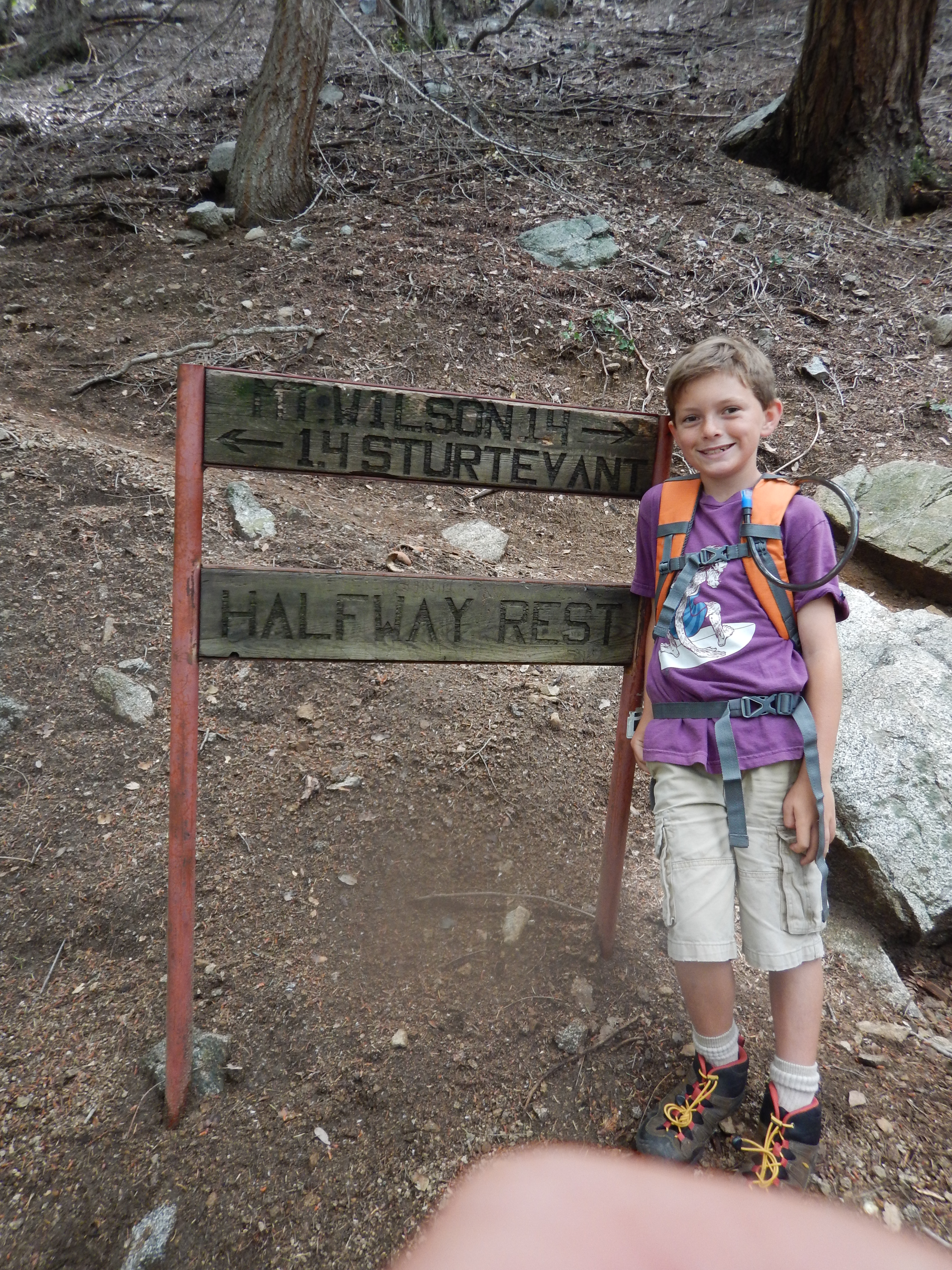 Finally at approx 2.30 we hit the top. We were all ecstatic. Tristan had nailed his first big peak. We looked around for the geographic marker that states the mountain’s height for the obligatory summit photo. We then found out that someone – very annoyingly – had stolen it. At the top were lots of people who’d driven up as there are roads to view the astronomical observatory established over a hundred years ago by George Ellery Hale. We put on jackets as it was actually cold and had our packed lunch. Unfortunately the views were of course obscured by the cloud and normally you can see the twinkling lights of the LA basin. Overall I’d swap a cooler ascent for sweeping views. I think…